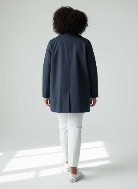 Diese dunkelblaue Trenchjacke gehört – genauso wie die sandfarbene Variante – zu den zeitlosen Klassikern, die in keinem Kleiderschrank fehlen sollten. Der elegante Schnitt reicht bis zur Mitte des Oberschenkels und sorgt für eine stilvolle, schmeichelhafte Silhouette.